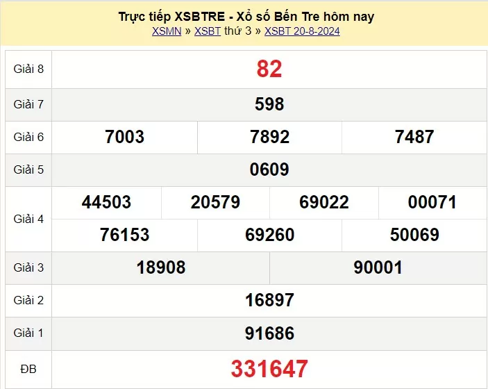 Xem lại Kết quả xổ số Bến Tre Thứ Ba ngày 20/8/2024