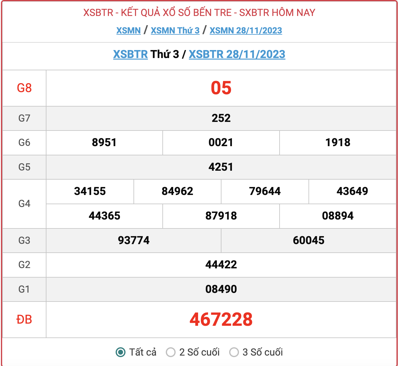 - Kết quả XSBTR thứ Ba ngày 28/11/2023