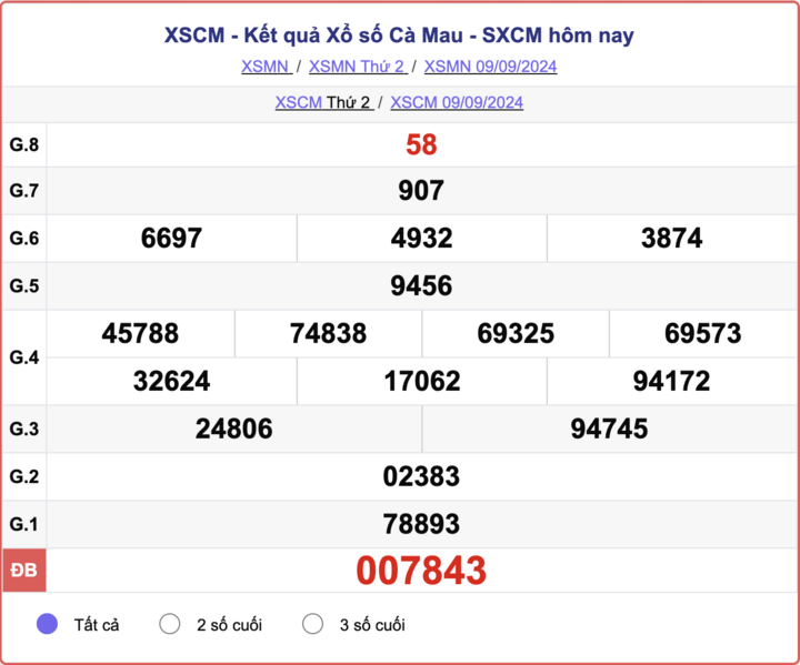 XSCM 16/9. Kết quả xổ số Cà Mau hôm nay - XSCM thứ Hai ngày 16/9/2024 sẽ được cập nhật siêu nhanh và chính xác nhất trên phuongtruongan. Kết quả các giải thưởng của XSCM ngày 16/9/2024 sẽ được công bố lần lượt từ giải nhất cho đến giải tám, cuối cùng là giải đặc biệt.