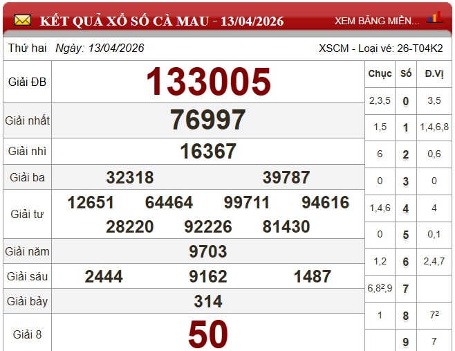 Kết quả xổ số Cà Mau ngày 13/4/2026