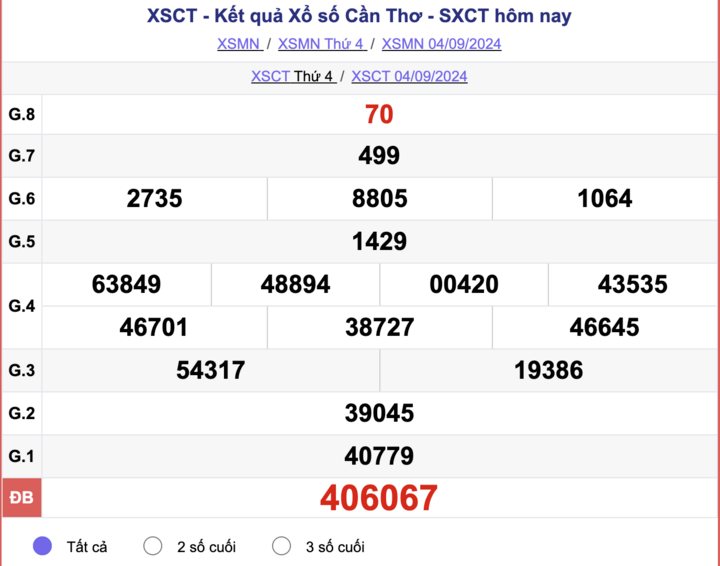 XSCT 11/9. Kết quả xổ số Cần Thơ hôm nay - XSCT thứ Tư ngày 11/9/2024 sẽ được cập nhật nhanh chóng và chính xác nhất. Kết quả các giải thưởng của XSCT ngày 11/9/2024 sẽ được công bố lần lượt từ giải nhất cho đến giải tám, cuối cùng là giải đặc biệt.