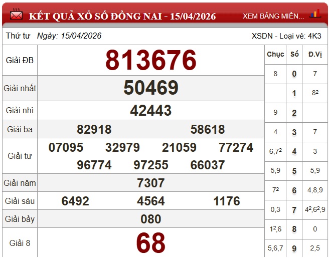 Kết quả xổ số Đồng Nai ngày 15/4/2026