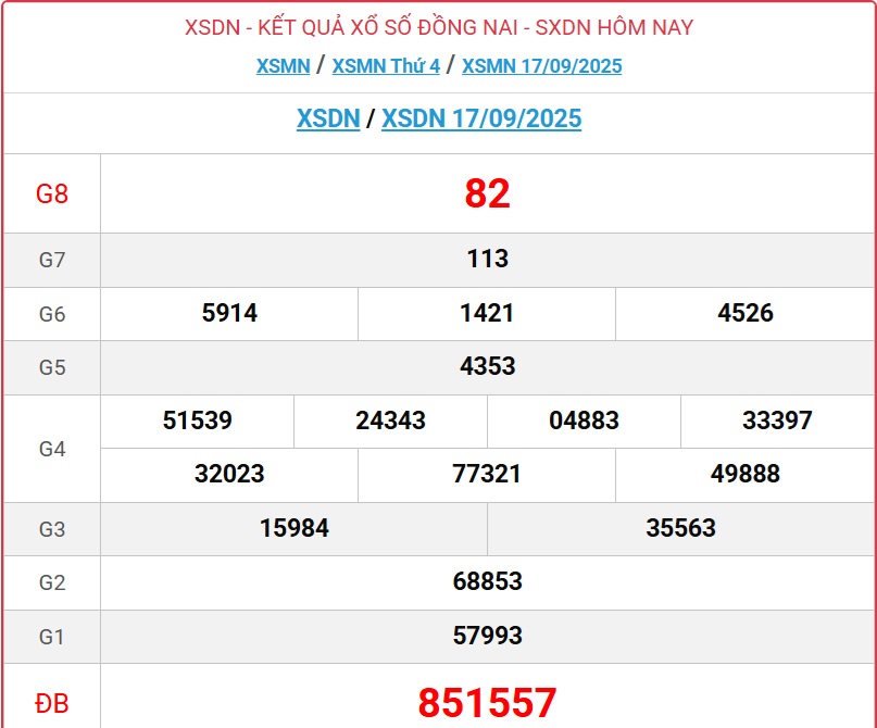 Kết quả xổ số Đồng Nai Thứ Tư ngày 17/9/2025