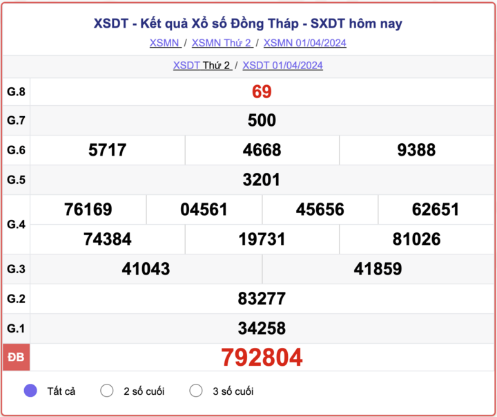 XSDT thứ 2, kết quả xổ số Đồng Tháp ngày 1/4/2024