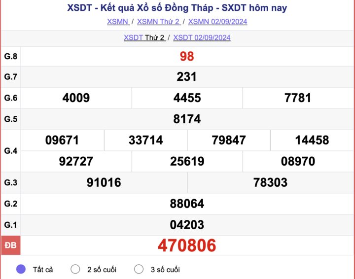 XSDT 9/9. Kết quả Xổ số hôm nay - KQXSĐT ngày 9/9 được quay thưởng bắt đầu từ giải tám cho đến giải nhất, cuối cùng là công bố kết quả giải đặc biệt. Kết quả xổ số Đồng Tháp được quay vào lúc 16 giờ 15 phút vào ngày thứ hai hàng tuần, mở thưởng bởi Công ty Xổ số kiến thiết Đồng Tháp và bắt đầu từ giải tám cho đến giải nhất, cuối cùng là công bố giải đặc biệt.
