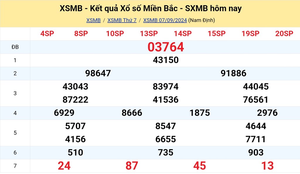XSMB 7/9, kết quả xổ số miền Bắc hôm nay 7/9/2024.