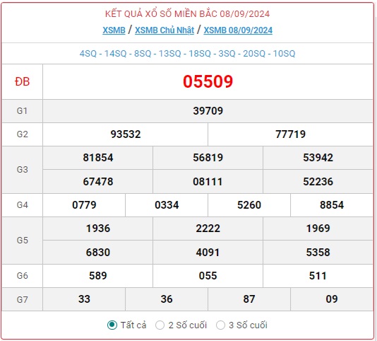 XSMB 8/9, kết quả xổ số miền Bắc hôm nay 8/9/2024.