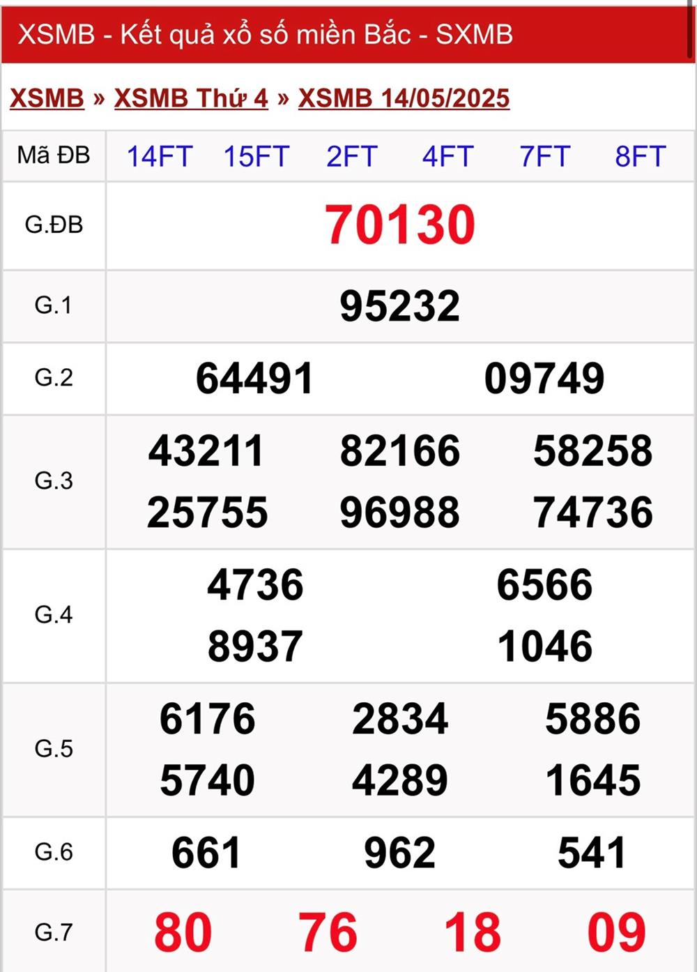 XSMB 14/5, kết quả xổ số miền Bắc (KQXSMB) ngày 14/5/2025.