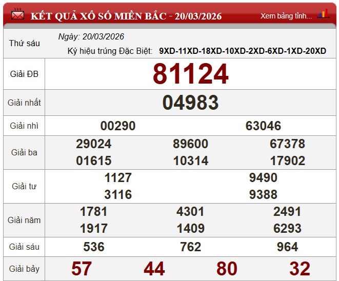 Kết quả Xổ số miền Bắc ngày 20/3/2026