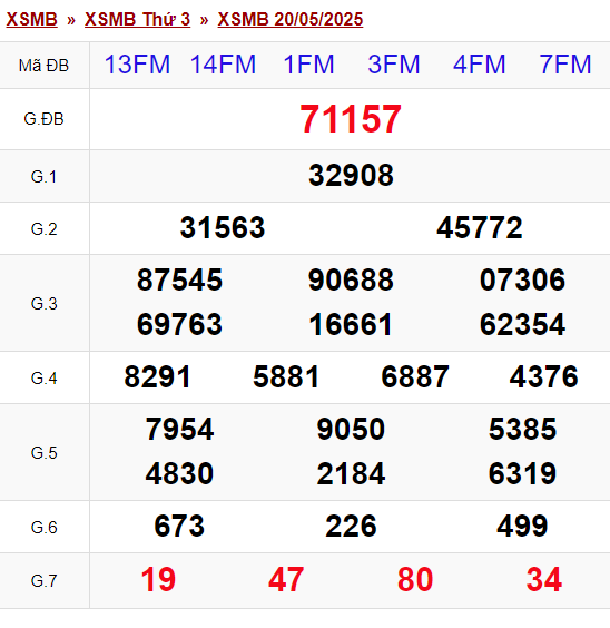 Kết quả xổ số miền Bắc (XSMB) ngày 20/5