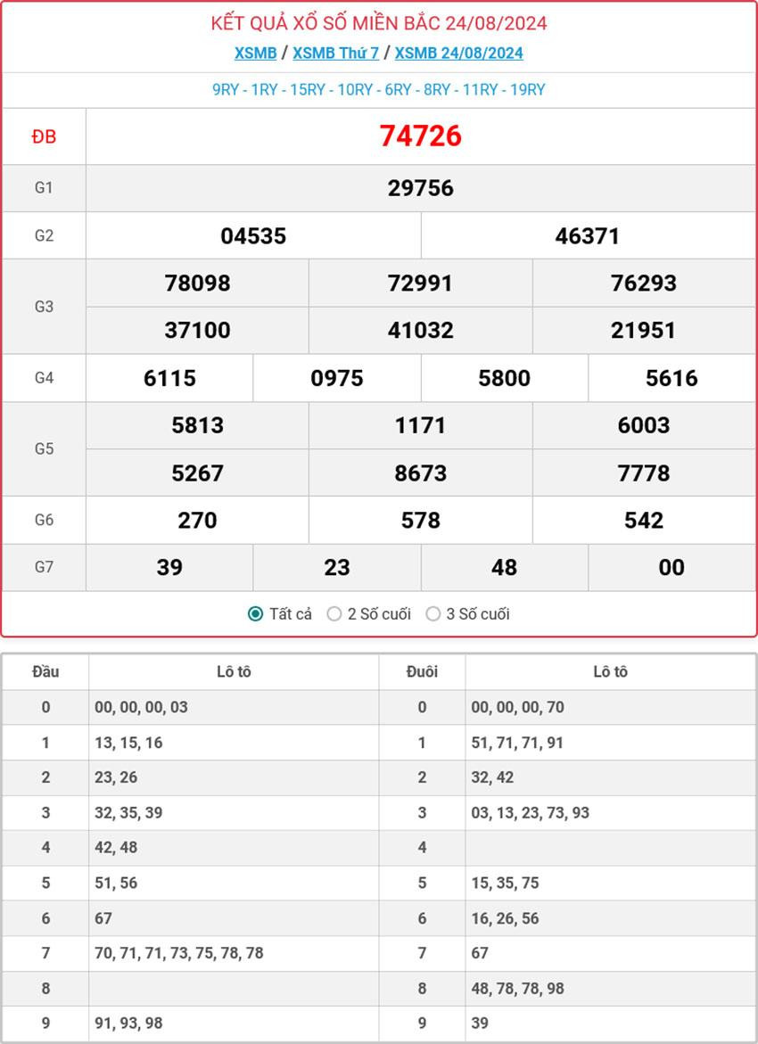 Kết quả xổ số miền Bắc ngày 24/8 - KQXSMB 24/8/2024 - XSMB 24/8.