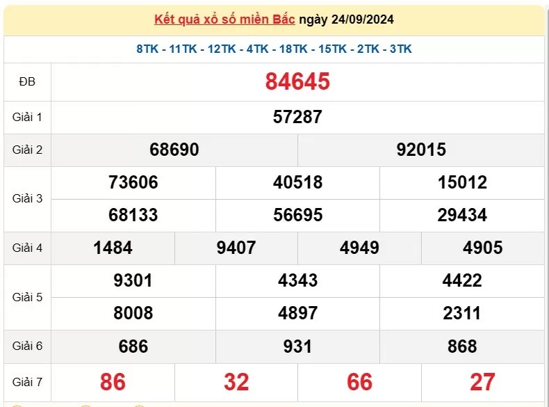 XSMB, Xổ số miền Bắc ngày 24 tháng 9