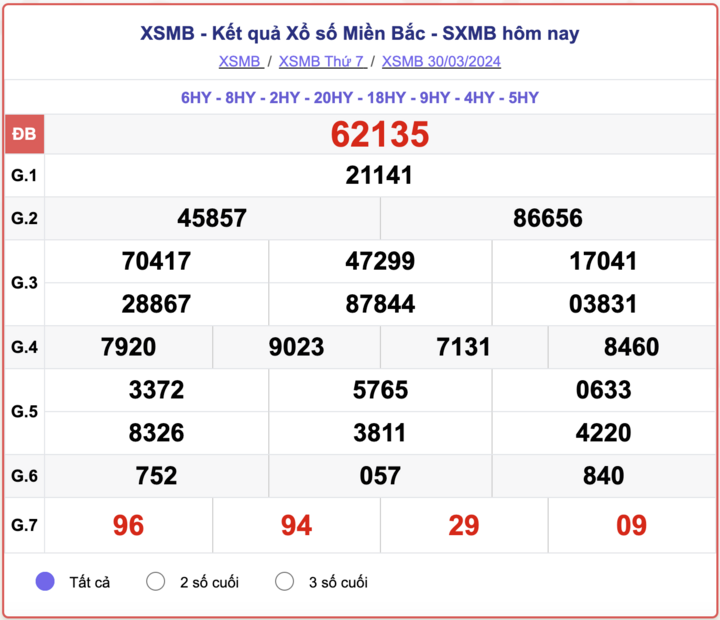 XSMB thứ bảy, kết quả xổ số miền Bắc ngày 30/3/2024.