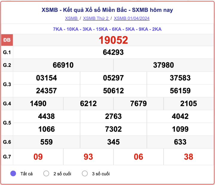 XSMB thứ 3, kết quả xổ số miền Bắc ngày 2/4/2024