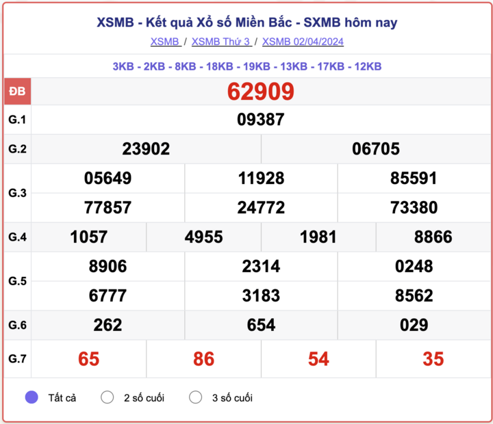 XSMB thứ 3, kết quả xổ số miền Bắc ngày 2/4/2024