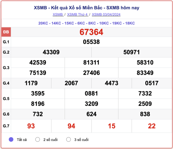 XSMB thứ 4, kết quả xổ số miền Bắc ngày 3/4/2024