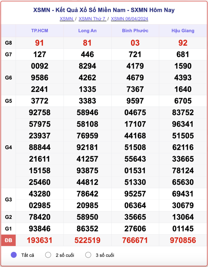 - Kết quả XSMN ngày 6/4/2024