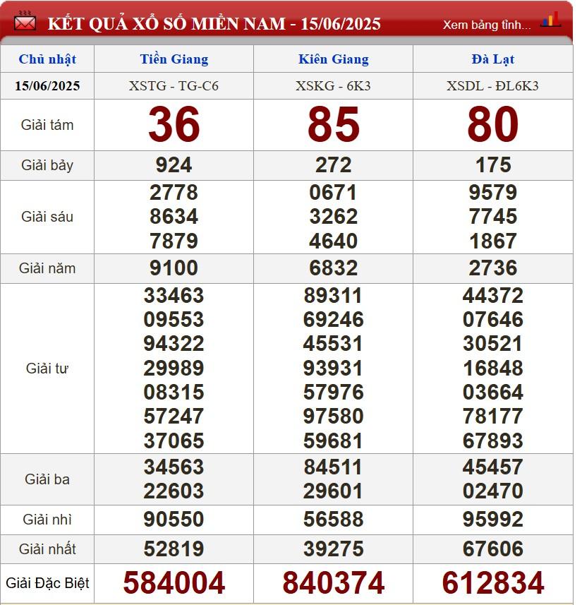 - Chủ nhật hàng tuần xổ số miền Nam được mở thưởng tại Kiên Giang, Tiền Giang, Đà Lạt