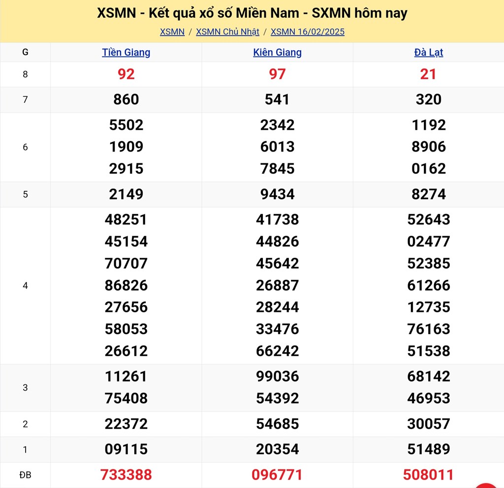 - Chủ nhật hàng tuần xổ số miền Nam được mở thưởng tại Kiên Giang, Tiền Giang, Đà Lạt