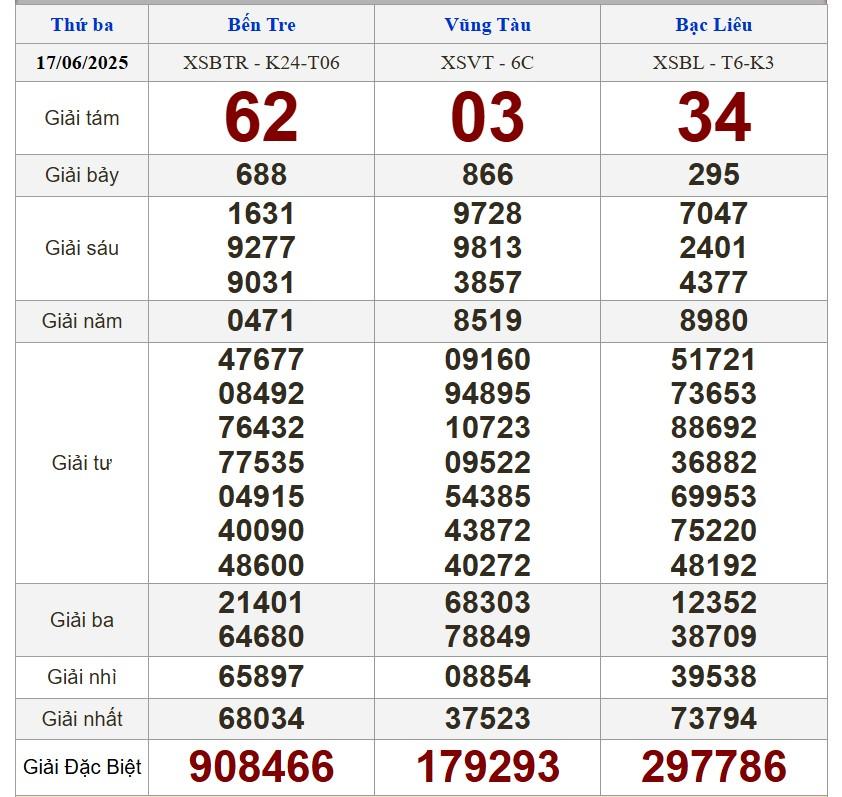 - Thứ 3 hàng tuần xổ số miền Nam được quay thưởng tại Bạc Liêu, Bến Tre, Vũng Tàu.