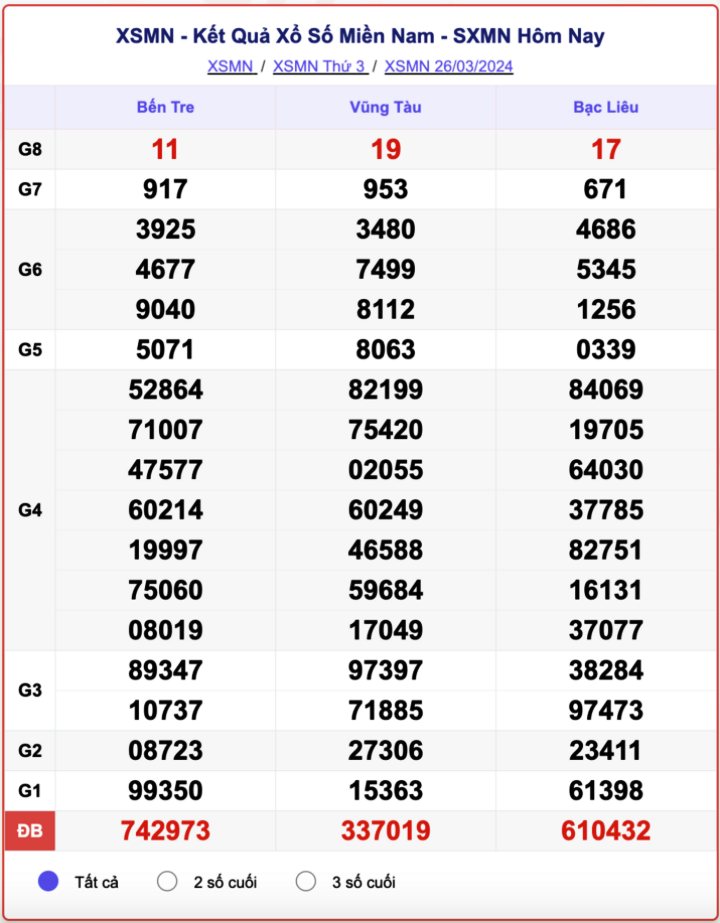 XSMN thứ 3, kết quả xổ số miền Nam ngày 26/3/2024