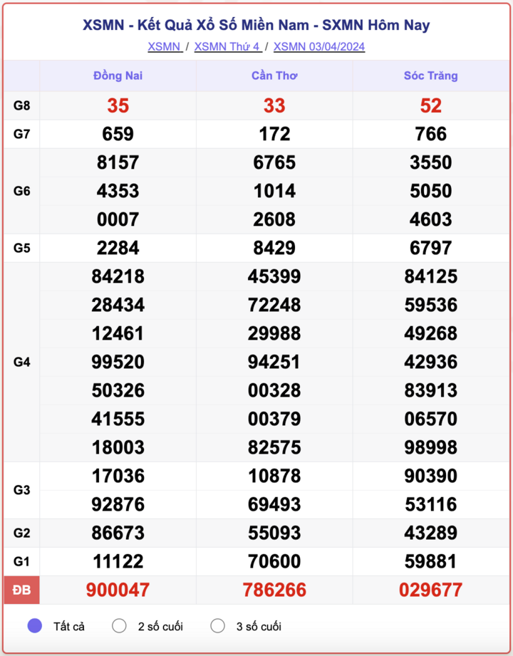 XSMN thứ 4, kết quả xổ số miền Nam ngày 3/4/2024