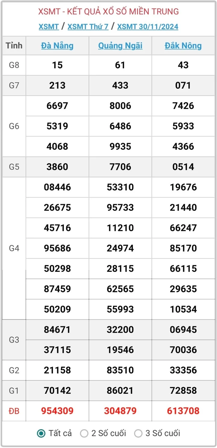 XSMT 5/12. Kết quả xổ số miền Trung hôm nay - XSMT thứ Năm ngày 05/12/2024 sẽ được cập nhật trực tiếp trên LDG. Kết quả các giải thưởng của XSMT ngày 05/12/2024 sẽ được công bố lần lượt từ giải nhất đến giải tám, cuối cùng là giải đặc biệt.