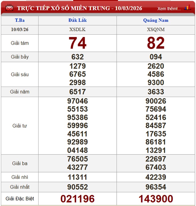 Kết quả xổ số miền Trung (XSMT) hôm nay ngày 10/3