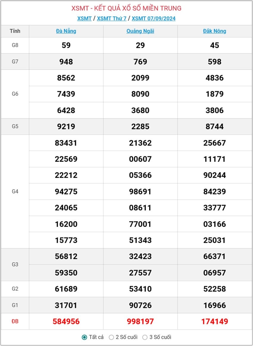 Kết quả xổ số miền Trung (XSMT) được thực hiện lúc 16 giờ 30 phút và được mở thưởng bởi Công ty xổ số kiến thiết của tỉnh Quảng Nam (XSQNA), Đắk Lắk (XSĐL). Kết quả của đài nào sẽ được mở thưởng tại trường quay của tỉnh đó. Xổ số hôm nay - KQXSMT ngày 10/9 được quay thưởng bắt đầu từ giải tám cho đến giải nhất, cuối cùng là công bố kết quả giải đặc biệt.