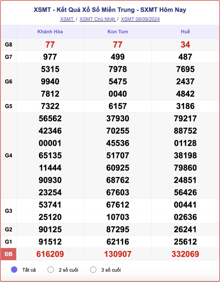 XSMT 12/9. Kết quả xổ số miền Trung hôm nay - XSMT thứ Năm ngày 12/9/2024 sẽ được cập nhật nhanh chóng và chi tiết nhất. Kết quả các giải thưởng của XSMT ngày 12/9/2024 sẽ được công bố lần lượt từ giải nhất cho đến giải tám, cuối cùng là giải đặc biệt.