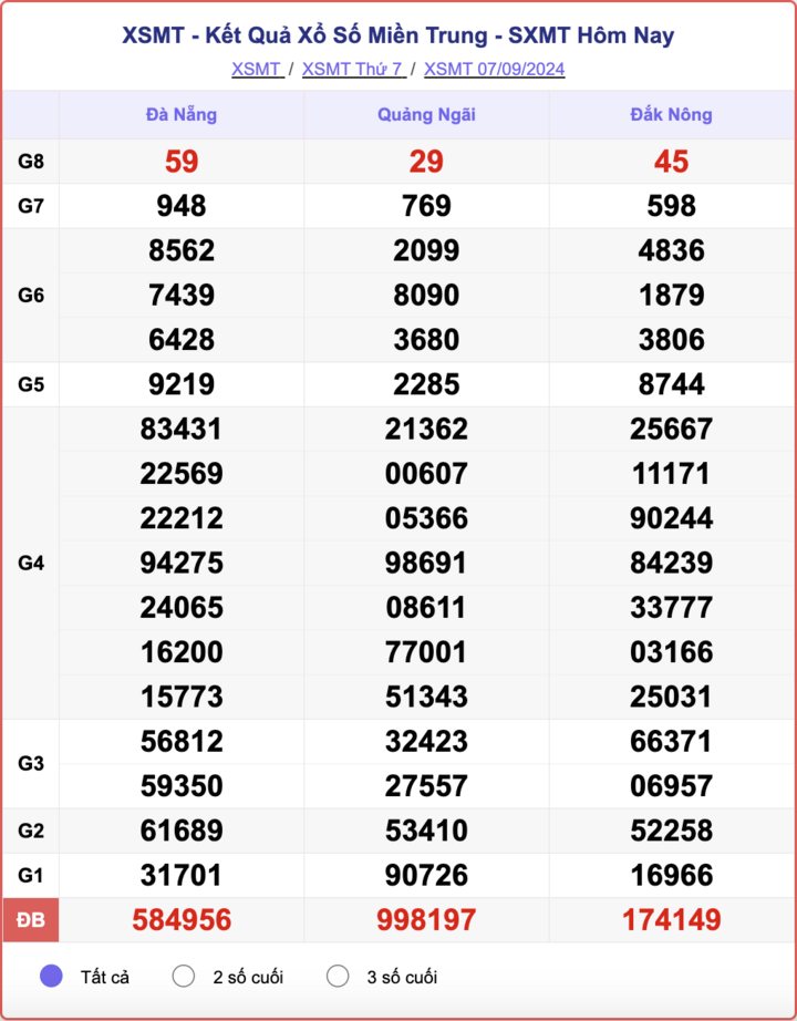 - Thứ 7 hàng tuần xổ số miền Trung sẽ quay thưởng tại Đắk Nông, Quảng Ngãi, Đà Nẵng