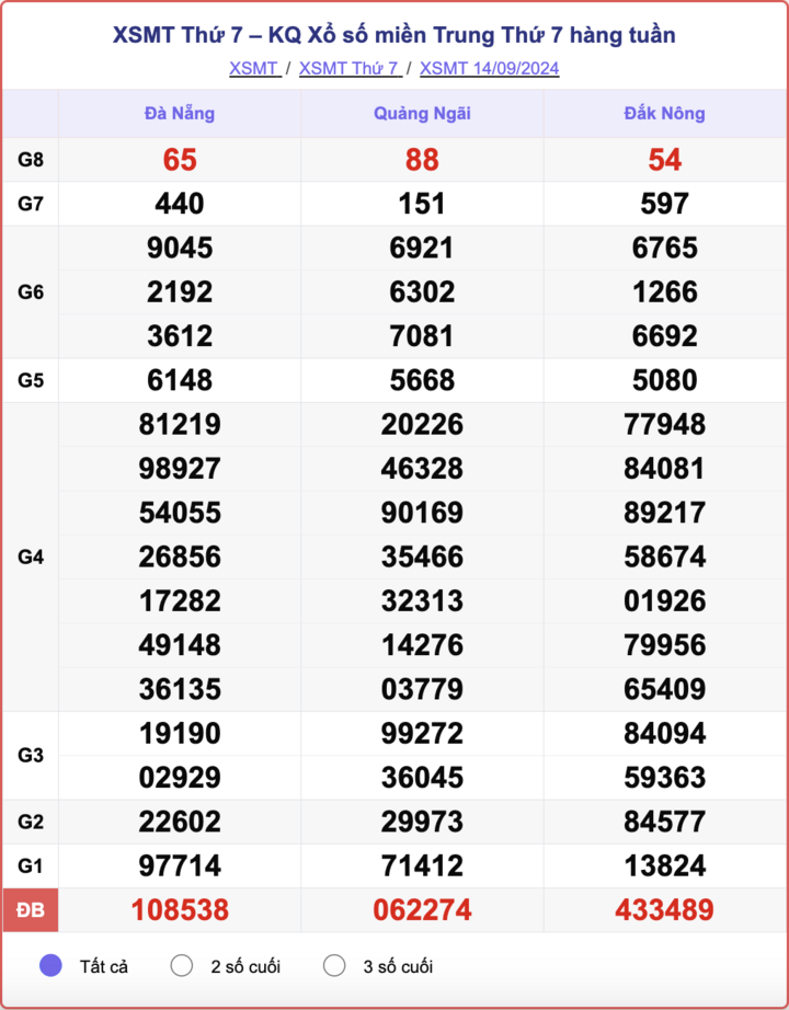 - Thứ 7 hàng tuần xổ số miền Trung được quay thưởng tại Đắk Nông, Quảng Ngãi, Đà Nẵng.