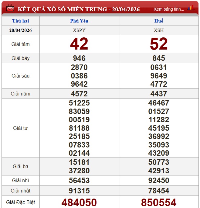 Kết quả xổ số miền Trung ngày 20/4/2026
