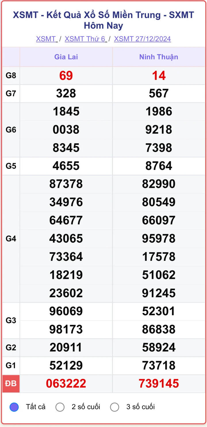 Kết quả xổ số miền Trung (XSMT) được thực hiện lúc 16 giờ 30 phút và được mở thưởng bởi Công ty xổ số kiến thiết của Kon Tum (XSKTUM), Khánh Hòa (XSKH) và Thừa Thiên Huế (XSTTH). Kết quả của đài nào sẽ được mở thưởng tại trường quay của tỉnh đó. Xổ số hôm nay - KQXSMT ngày 29/12 được quay thưởng bắt đầu từ giải tám cho đến giải nhất, cuối cùng là công bố kết quả giải đặc biệt.