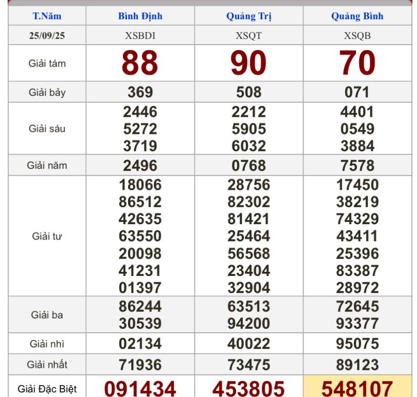 - Thứ Năm: Xổ số miền Trung (XSMT) được quay tại 3 đài Bình Định (XSBDI), Quảng Trị (XSQT) và Quảng Bình (XSQB).