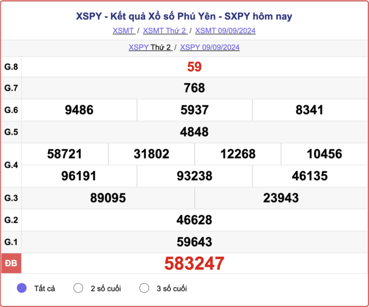 XSPY 16/9. Kết quả xổ số Phú Yên hôm nay - XSPY thứ Hai ngày 16/9/2024 sẽ được cập nhật siêu nhanh và chính xác nhất trên phuongtruongan. Kết quả các giải thưởng của XSPY ngày 16/9/2024 sẽ được công bố lần lượt từ giải giải nhất cho đến giải tám, cuối cùng là giải đặc biệt.