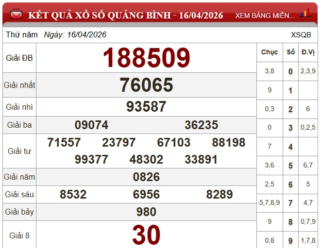 XSQB 16/4 - Trực tiếp kết quả xổ số Quảng Bình hôm nay 16/4/2026, xổ số Quảng Bình Thứ Năm ngày 16/4/2026, xổ số Quảng Bình 16/4.