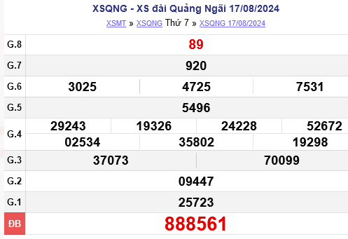 Kết quả xổ số Quảng Ngãi Thứ Bảy ngày 17/8/2024