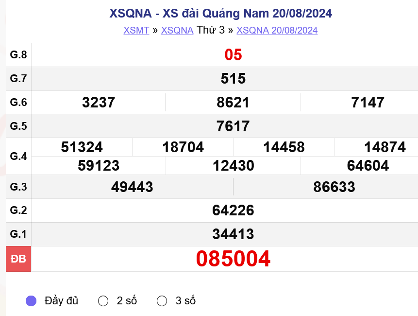 Xem lại Kết quả xổ số Quảng Nam Thứ Ba ngày 20/8/2024