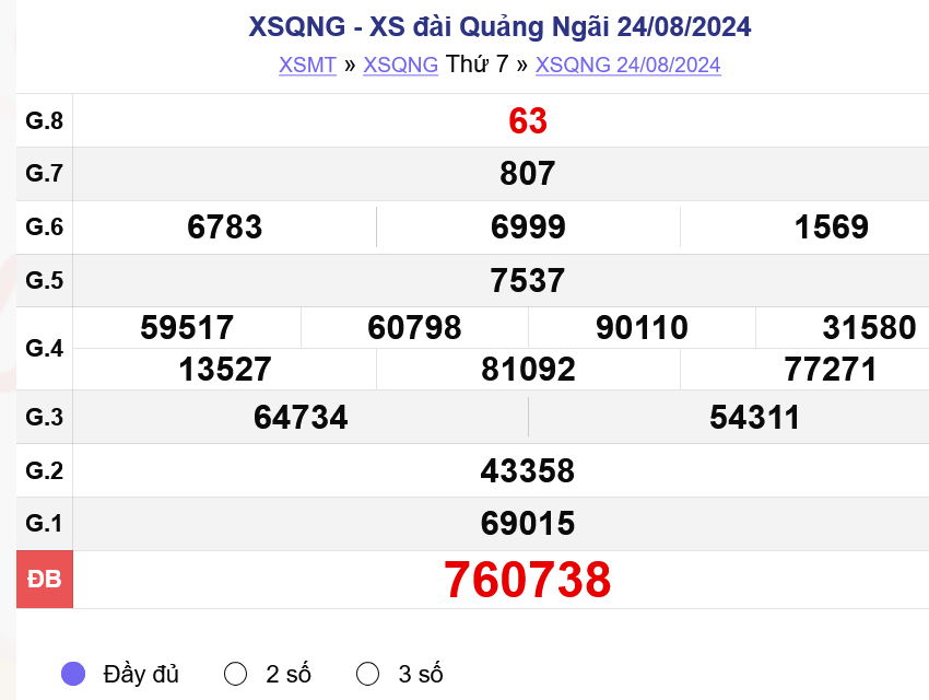 Xem lại Kết quả xổ số Quảng Ngãi Thứ Bảy ngày 24/8/2024 - XSQNG - XS đài Quảng Ngãi 24/08/2024.