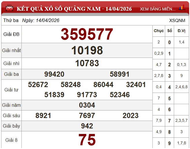 Theo dõi kết quả xổ số Quảng Nam hôm nay 14/4/2026 nhanh chóng, chính xác nhất để không bỏ lỡ thời gian nhận thưởng.