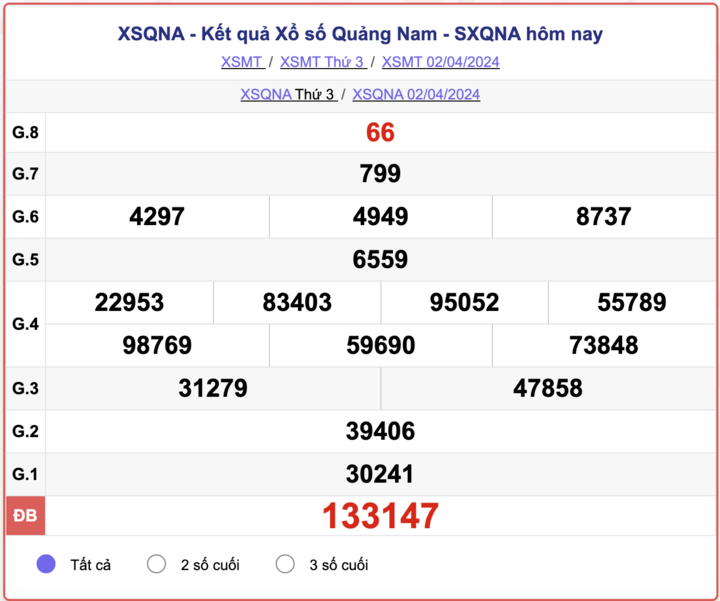 XSQNA thứ 3, kết quả xổ số Quảng Nam ngày 2/4/2024
