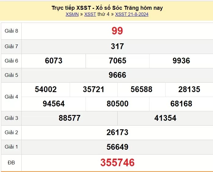 Xem lại Kết quả xổ số Sóc Trăng Thứ Tư ngày 21/8/2024