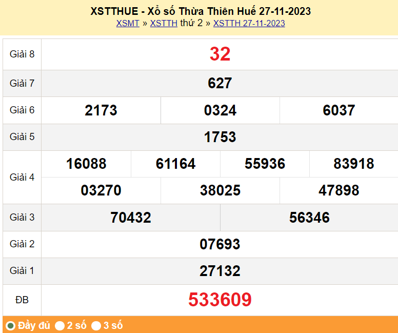 XSTTH thứ 2, kết quả xổ số Thừa Thiên Huế ngày 27/11/2023