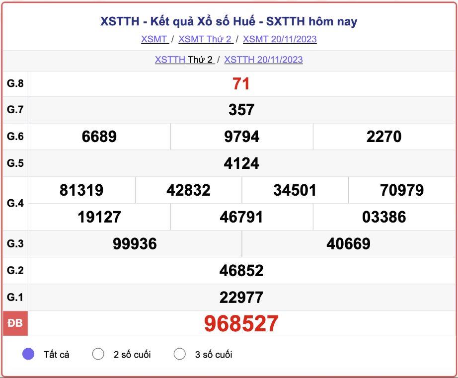 XSTTH thứ 2, kết quả xổ số Thừa Thiên Huế ngày 20/11/2023