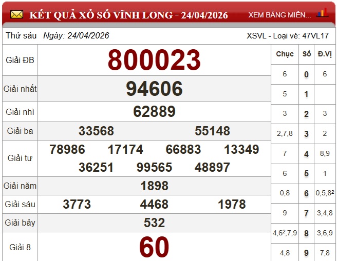 Kết quả xổ số Vĩnh Long Thứ Sáu ngày 24/4/2026