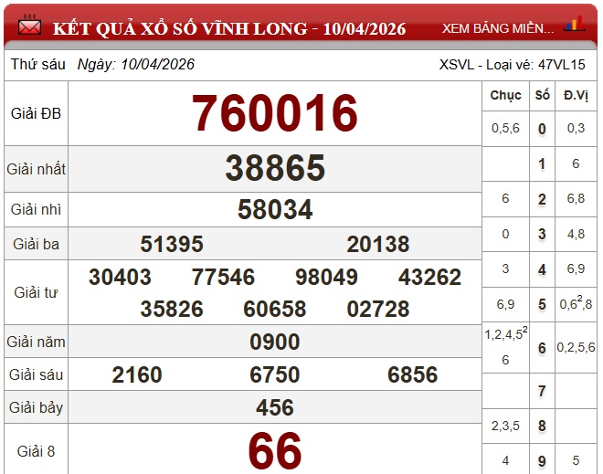 Kết quả xổ số Vĩnh Long Thứ Sáu ngày 10/4/2026