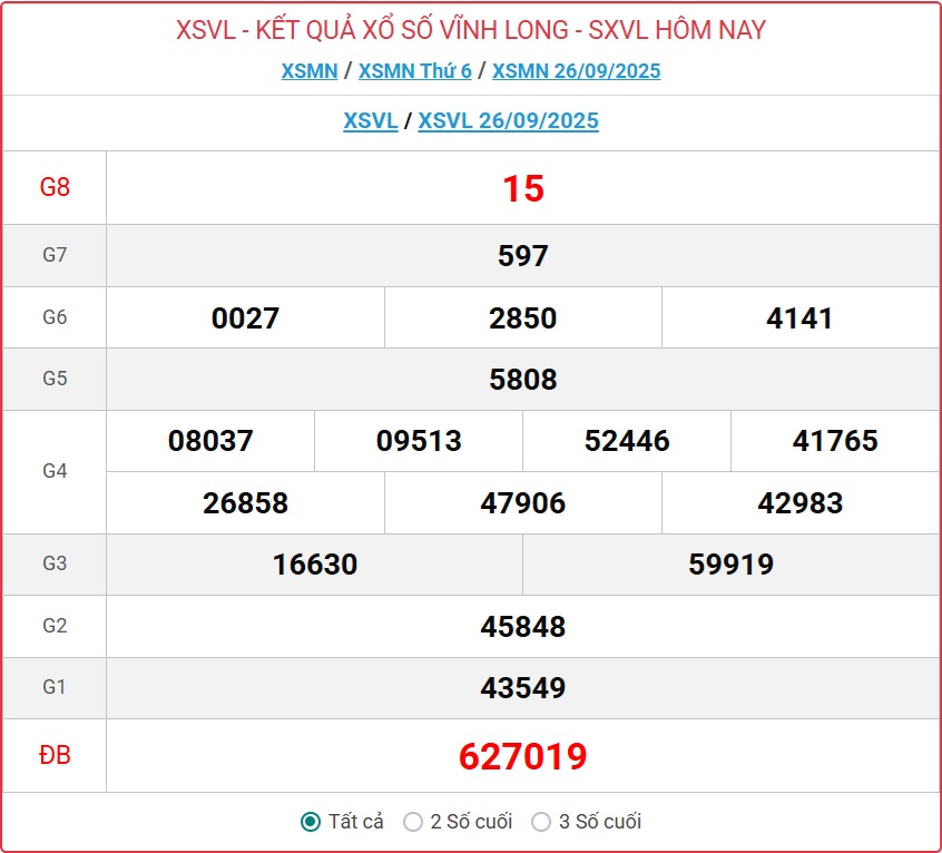 Kết quả xổ số Vĩnh Long ngày 26/9/2025