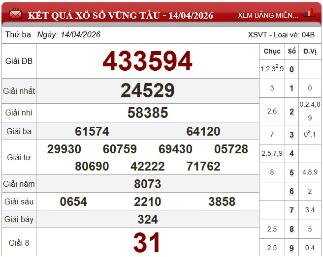 Theo dõi kết quả xổ số Vũng Tàu hôm nay 14/4/2026 nhanh chóng, chính xác nhất để không bỏ lỡ thời gian nhận thưởng.