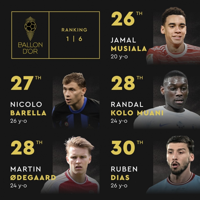 Ở vị trí thứ 27 là tiền vệ Nico Barella của Inter Milan. Trong khi tiền vệ gốc Croydon của Bayern Munich - Jamal Musiala đứng ở vị trí thứ 26. Và Josko Gvardiol của Man City đứng thứ 25.